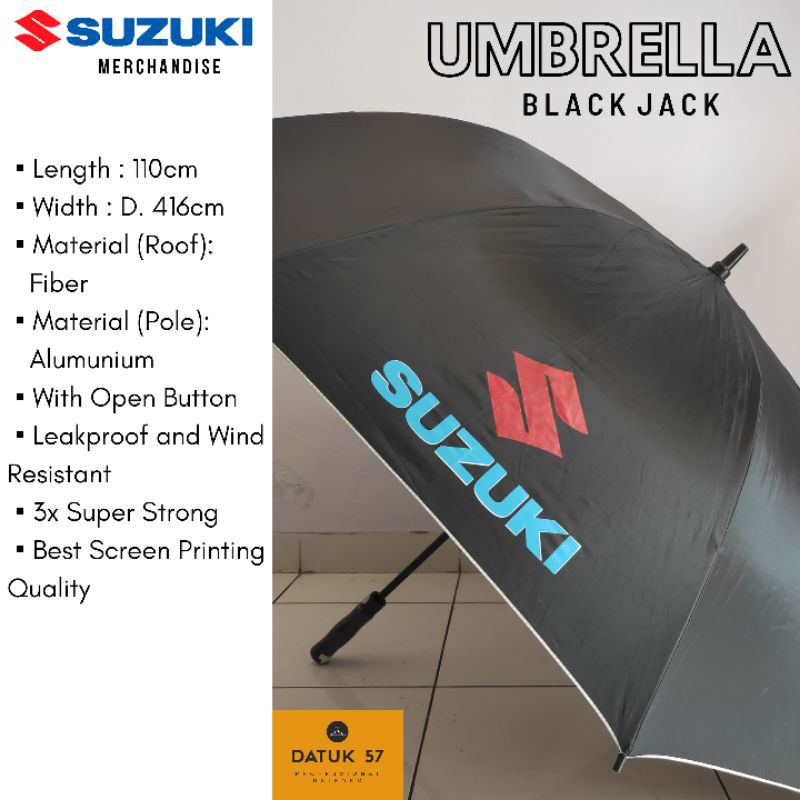 Item : Souvenir Payung Suzuki GolfBahan : Fiber (Atap,) Alumunium (Kerangka)Harga : Rp. 95.000,-/ Pcs (Sudah termasuk secure pack)Panjang Payung : 110cmLebar Atap Payung : D. 416cmKeunggulan Payung :-Barangnya sangat awet untuk jangka panjang-Fiber tidak gampang bocor karena terdapat 2 lapis.-Bahan alumunium yang kokoh dan tidak mudah patah.-Walau terkena angin kencang dapat mudah dibetulkan-Lebih l