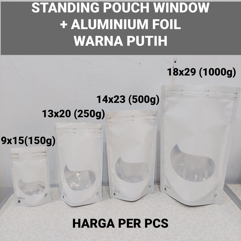 Standing Pouch PREMIUM Window Bag Food Grade - Premium Zip Lock - Attractive Fun Window ShapesKetebalan: 80 micronPilihan warna: Putih DoffHARGA TERTERA ADALAH HARGA 1 PCSTERSEDIA HARGA PER PACK ISI 100 PCSBISA DICEK DI KATEGORI TOKO YAKelebihan kemasan Standing Pouch Window Bag:- dengan adanya window konsumen dapat melihat produk anda- bentuk window sangat menarik- kemasan bisa berdiri tegak tanpa sandaran- dengan zip lock, kemasan bisa di tutup kembali setelah di buka- zip lock juga berfungsi sebagai pengaman ekstra- warna doff, elegan dan eksklusif- printed logo food gradePERKIRAAN KAPASITAS/ ISI:1. Ukuran 9x15cmIsi minuman/ pudot 120 - 150mlIsi aneka bubuk 50 grIsi cemilan / snack / kacang / keripik 50 grisi gula pasir 150 gr2. Ukuran 13x20cmIsi minuman250ml - 500mlIsi aneka bubuk 100 - 200 grIsi cemilan / snack / kacang / keripik 100 grisi gula pasir 250 gr3. Ukuran 14x23cmIsi cemilan / snack / kacang / keripik 200 - 250 grIsi aneka bubuk 250 grisi gula pasir 500 gr4. Ukuran 18x29cmIsi cemilan / snack / kacang / keripik 500 grIsi aneka bubuk 500 grisi gula pasir 1100 gr 5. Ukuran 22x29cmIsi aneka bubuk 1000 grIsi cemilan / snack / kacang / keripik 1000 grisi gula pasir 20