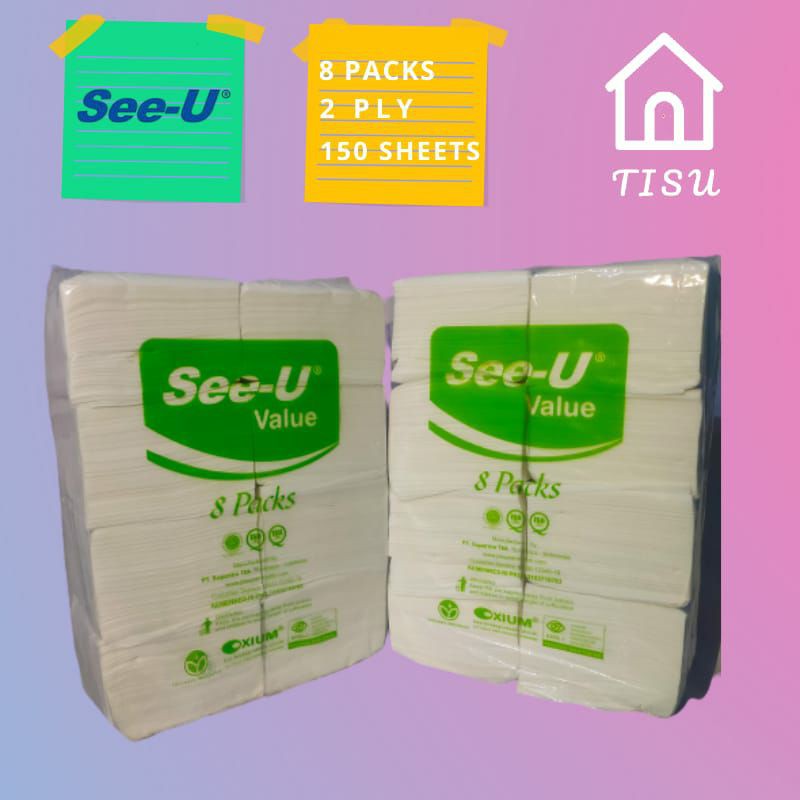 1 pak isi 8 bh ( +/- 150sheet / bh ) Tissue pop up merek See-U , Hemat dan banyak di gunakan di rumah makan dan di rumah. Isi tissue banyak dan bagus lembut, tidak terlalu besar dan tidak boro