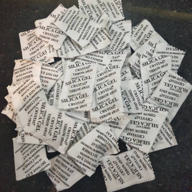 harga diatas adalah harga per sachet bahan dasar dari batu tambang Zeolit yang diproses menjadi pasir silica tanpa tambahan zat kimia. Aman untuk penggunaan makanan dan obat-obatan agar tidak mudah rusak, apek, dan menjamur akibat dari kelembaban udara dalam kemasan barang tersebut.Silica gel dapat menyerap kelembaban udara hingga 40% dari beratnya. Mencegah jamur & bau untuk menyimpan diecast, tas kulit, sepatu, buku, kamera, lensa, dll.Jumlah Silica-Gel yang digunakan pada umumnya untuk produk :1. Sepatu 2 - 8 sachet2. Dompet 1 - 5 sachet3. Tas kecil 3 - 10 sachet4. Tas besar 5 - 20 sachet5. kamera & lensa 10 - 60 sachet6. Jaket 20 - 60 sachet7. Arloji 1 - 3 sachet8. Sarung Tangan 2 - 8 sachet9. Sepatu Boots 4 - 15 sachet10. Barang Elektronik Besar 20 - 100 sachet11. Furniture 50 - 200 sachetWaktu untuk penggantian Silica Gel dengan kondisi lingkungan :1. Kelembaban tinggi 2 minggu - 1 bulan2. Kelembaban menengah 1 bulan - 4 bulan3. Kelembaban rendah 3 bulan - 1 tahun4. Cenderung kering 6 bulan - 2