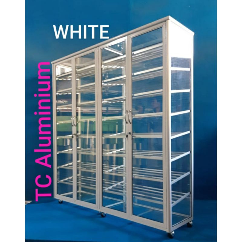 LEMARI RAK SEPATU 9 SUSUN.DIMENSI : Panjang 150 cm, Lebar 38 cm, ti3nggi 158 cm (ukuran luar termasuk roda)Bisa request:Ganti pintu cermin 300 rbBAHAN: ✅ Aluminium hollow 20U PUTIH tiang dan bingkai pintu,✅ Full Kaca bening 3 mili (atas bawah, sisi samping, pintu dan belakang) ✅ Pipa aluminium untuk rak sepatu,✅ Handle silver zinc alloy .✅ Roda 6 pcs.FITUR PRODUK:- Sepatu dan sandal koleksi Anda tersimpan rapi dan indah di lemari ini, tidak berserakan lagi serta terhindar dari debu.- Lemari ini muat sekitar 54 sampai 72 pasang sepatu dan sandal, tinggi rak sekitar 14.5 cm.- Tanpa sekat vertikal di dalam rak sehingga muat lebih banyak. - Produk terbuat dari bahan berkualitas sehingga lebih awet, kuat dan kokoh. - Karyawan kami yang berpengalaman merakit produk ini bisa langsung digunakan, - Kurir kami akan mengantar lemari ini dengan aman ke tempat Anda.PENGIRIMAN.Berat yang tertera bukan berat produk ya, tapi hanya resi/amplop yang harus diisi supaya bisa diproses di applikasi ini. Barangnya kurir kami yang antar supaya lebih aman.FREE ONGKIR ke Jakarta, Depok, Kota Tangerang dan Kota Bekasi.Ke sebagian kabupaten Bekasi ada biaya ongkir. Jika lokasi Anda tidak tertera dibawah ini silahkan chat untuk info ya..- Tambun, Setu, Cibitung 60 rb,- Cikarang, Cibarusah 100 rb,- Kota/kabupaten Bogor termasuk Cibubur 100 rb,- Serang baru kabupaten Bekasi 100 rb,- Kota Serang Banten 150 rb,- Waringin Karawang 150 rb,- Cilegon 200 rb,- Kota Bandung (PO 2 minggu) 400 rb.NOTE:Mohon segera periksa produk saat barang sampai. Kami berharap Anda suka produknya. Bila ada yg kurang atau tidak sesuai, langsung sampaikan ke saya atau supir yang supaya bisa secepatnya ditangani produknya, diperbaiki di tempat, ganti baru atau diberikan solusi yang terbaik.Terima kasih.TC Alum