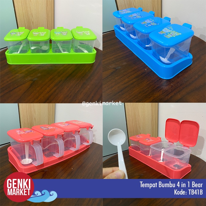 Tempat Bumbu 4 in 1 Bear Genki Market( Real Pict - No Edit ) Tersedia Warna : - Blue - Green - Pink Spesifikasi :Berat 250gramUkuran : panjang 29cm, tinggi: 8cmUkuran tempat bumbu: panjang 8cm, lebar 6cm, tinggi: 7cmTerdapat karakter lucu dan sendok tempat bumbu.Homeware & Livingroom #1 Free Bubblewarp Hi Kak, sebelum membeli, harap baca ini ya:1. Menjaga kepuasan belanja Kakak adalah komitmen kami.2. Semua pesanan selalu diperiksa sebelum dikirim.3. Setiap pembelian sudah gratis extra kardus dan bubble wrap lapis. Namun, jika Kakak ingin keamanan extra pada paket bisa membeli produk "Extra Bubble Wrap untuk Keamanan".4. Mohon dukung kami dengan beri rating 5 pada setiap pesanan. Penilaian Kakak sangat berarti bagi kami.Hi Kak, sebelum komplen, harap baca ini ya:1. Mohon jangan kasih rating buruk sebelum chat dengan kami.2. Semua komplen pasti kami layani, jangan ragu untuk chat.3. Wajib melampirkan video unboxing saat komplen.4. Kerusakan akibat pengiriman, harap jangan dilampiaskan kepada kami, karena itu benar-benar diluar kendali kami. Tapi kami bisa bantu komplen ke expedisi.5. Kami juga manusia yang bisa saja membuat kesalahan. Untuk itu kami mohon maaf sebesar-bes